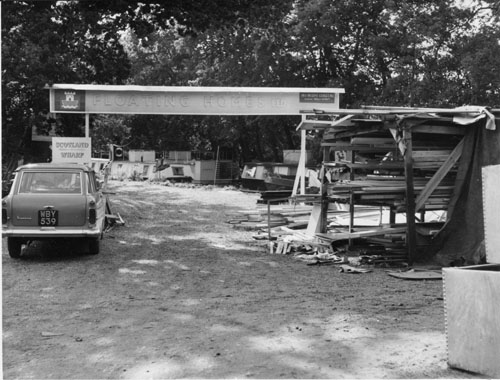 The Floating Homes site at Scotland Road Wharf, Woodham. Materials and boats awaiting conversion to houseboats. Sunbury in the background.