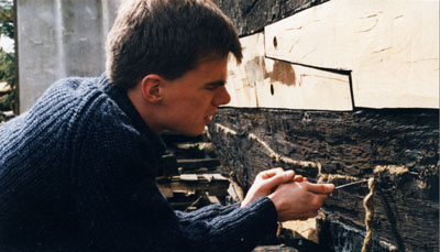 Hagley at Bates' boatyard, caulking shakes in the chine plank.
